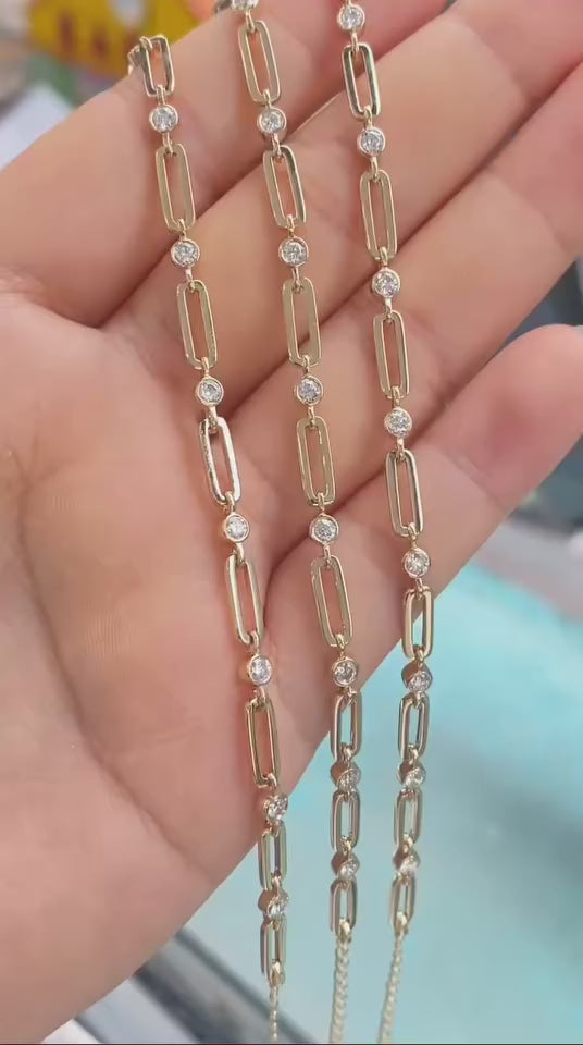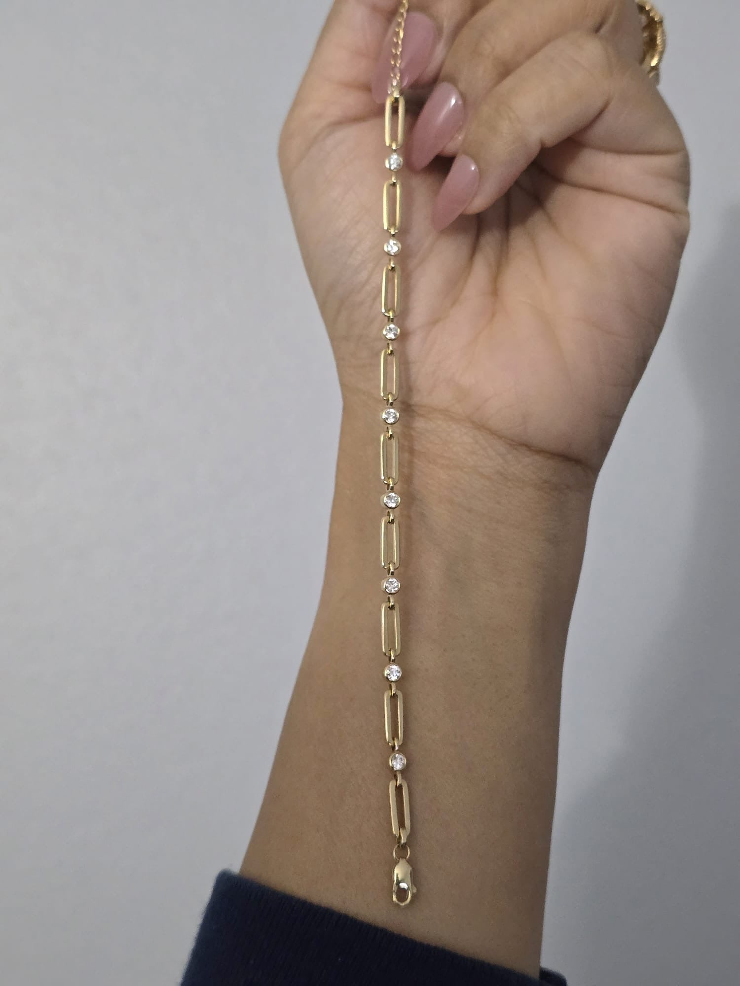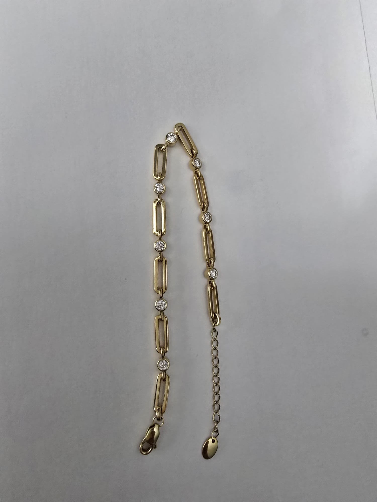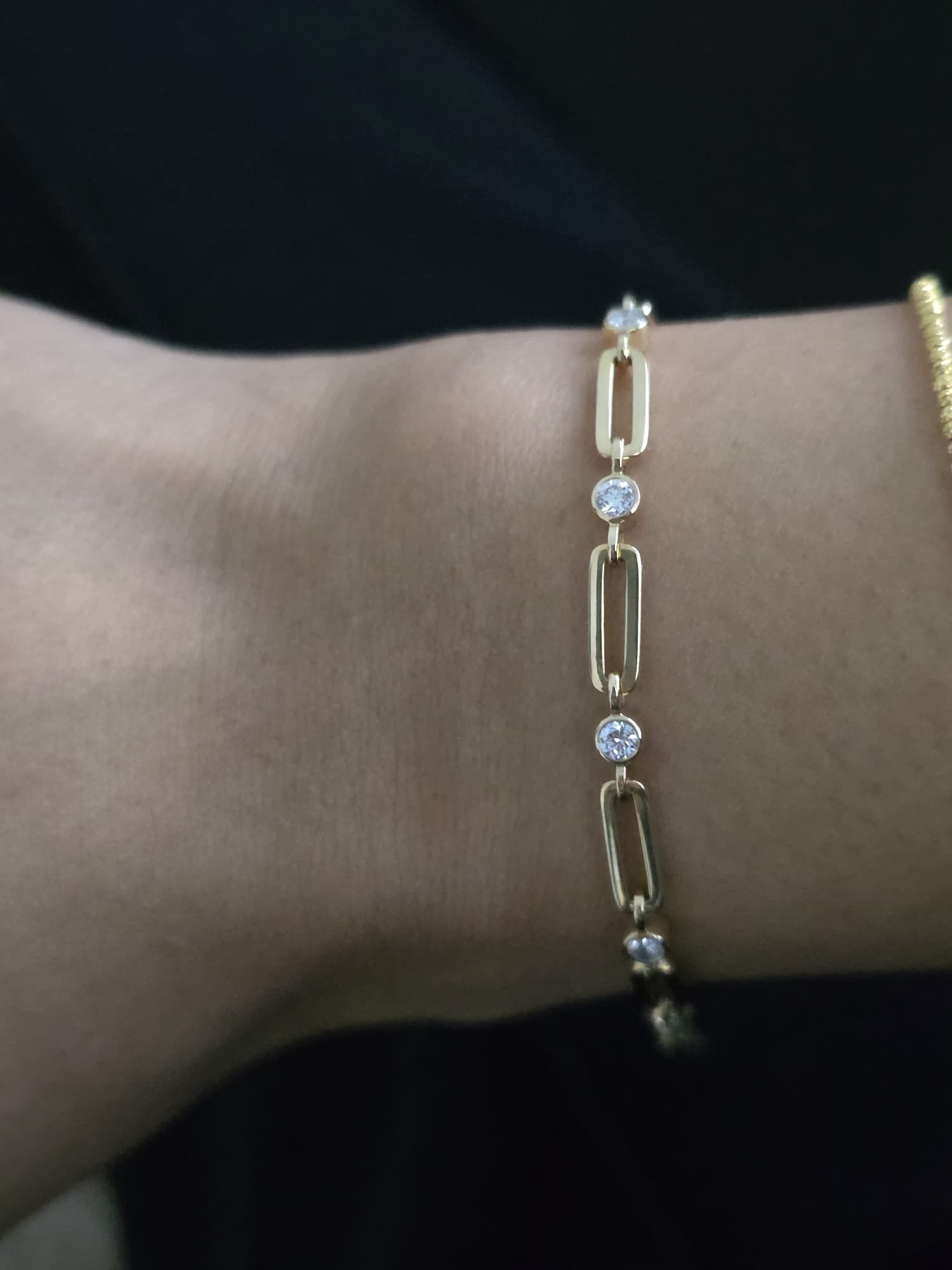 She is a 10 K yellow gold paper clip bracelet with 8 lab grown diamonds. The lab grown diamonds are 2.5mm, DEF color, VVS clarity, 0.48ct total weight.